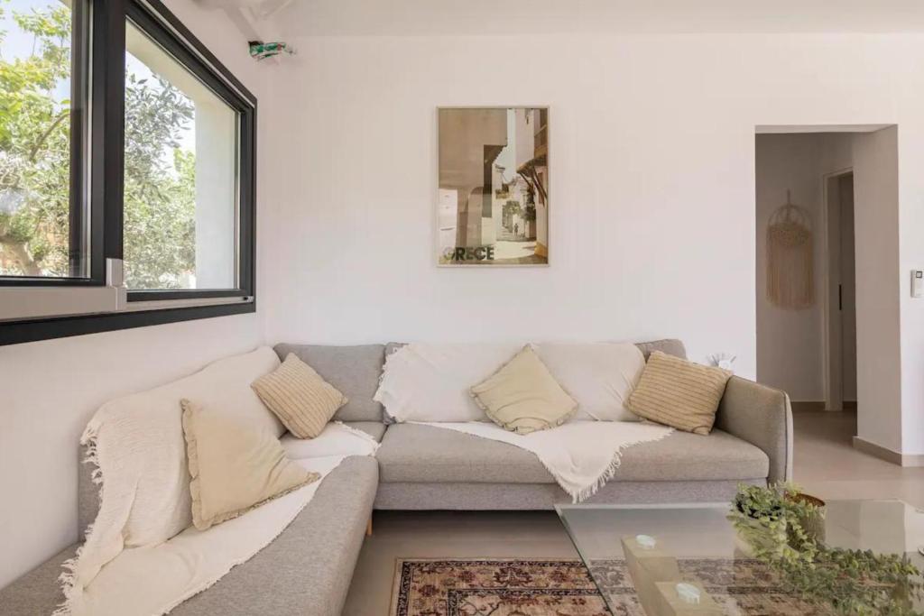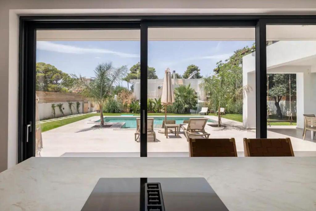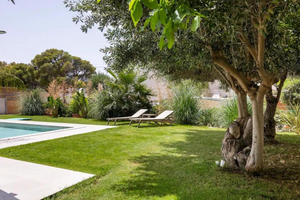 Surrounded by a lush green garden with palm trees and fruit trees, Villa Camila offers authentic Mediterranean views from every bedroom — olive trees, fig trees, and grapevines. Depending on the season, guests are welcome to pick fresh fruit directly from the garden.