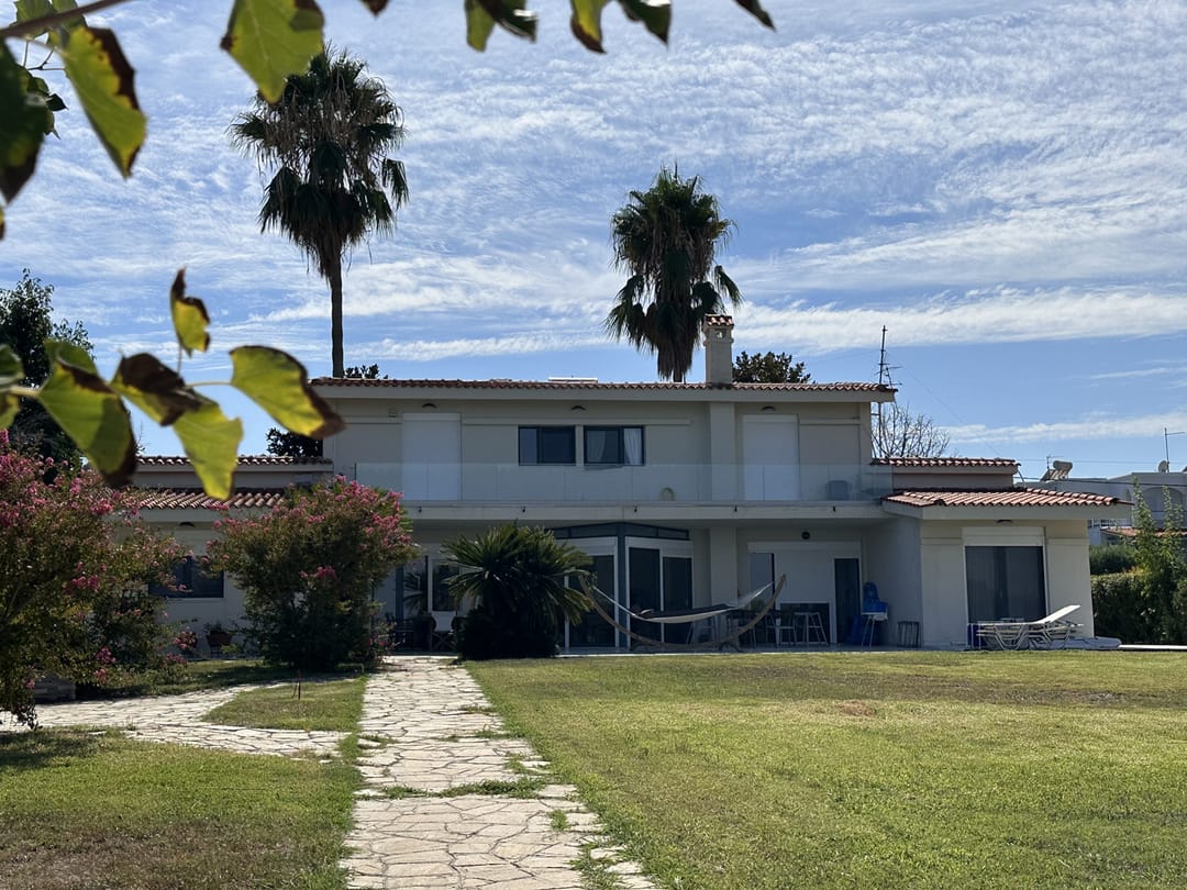 A comfortable beachfront villa Emma with 4–bedrooms and direct access to a sandy beach, located in a wonderful, secluded spot on the Kassandra peninsula, Halkidiki, near the village of Hanioti and available for rent.