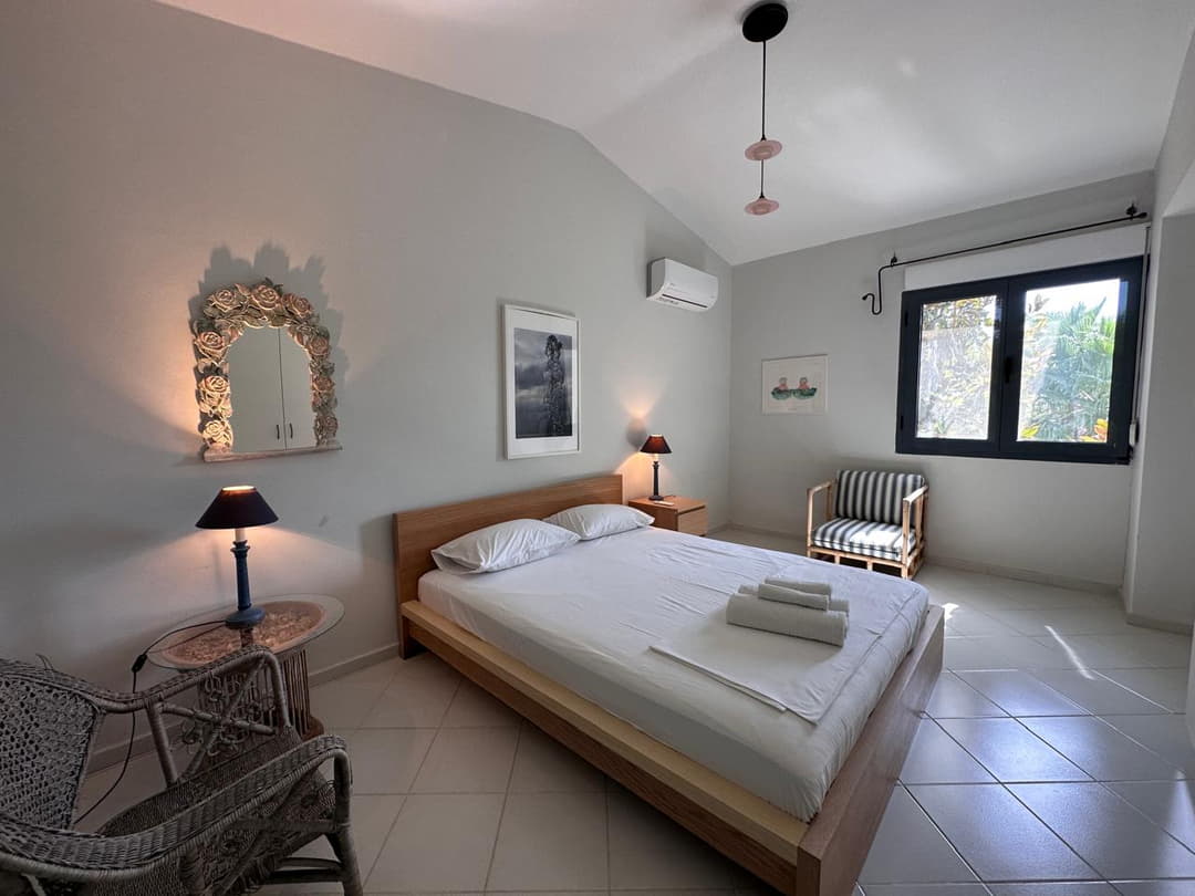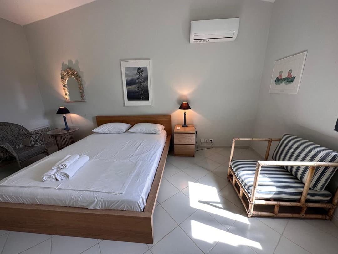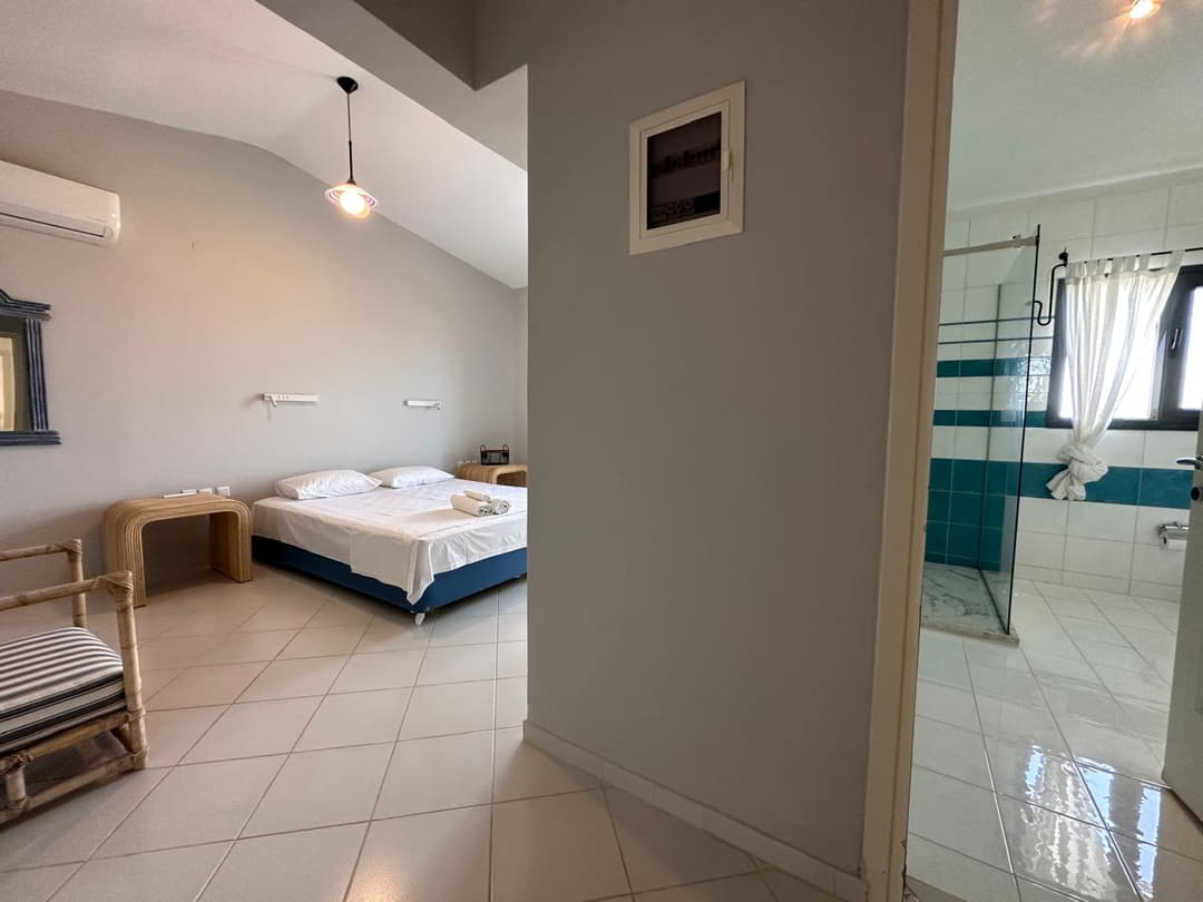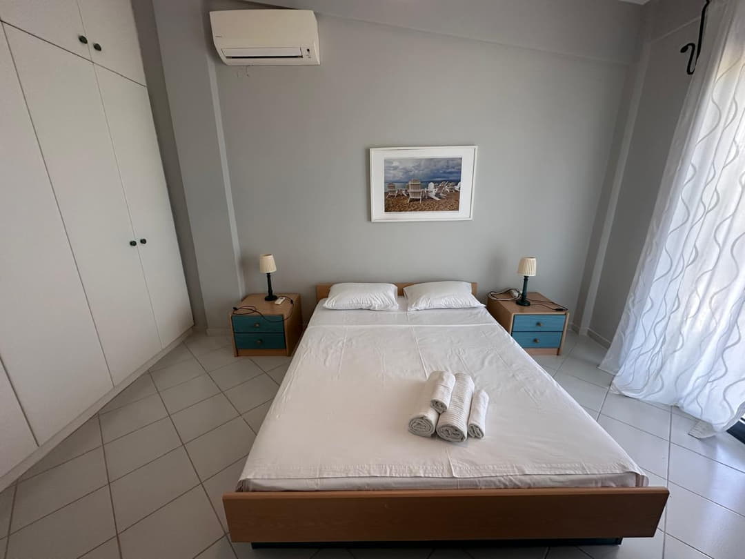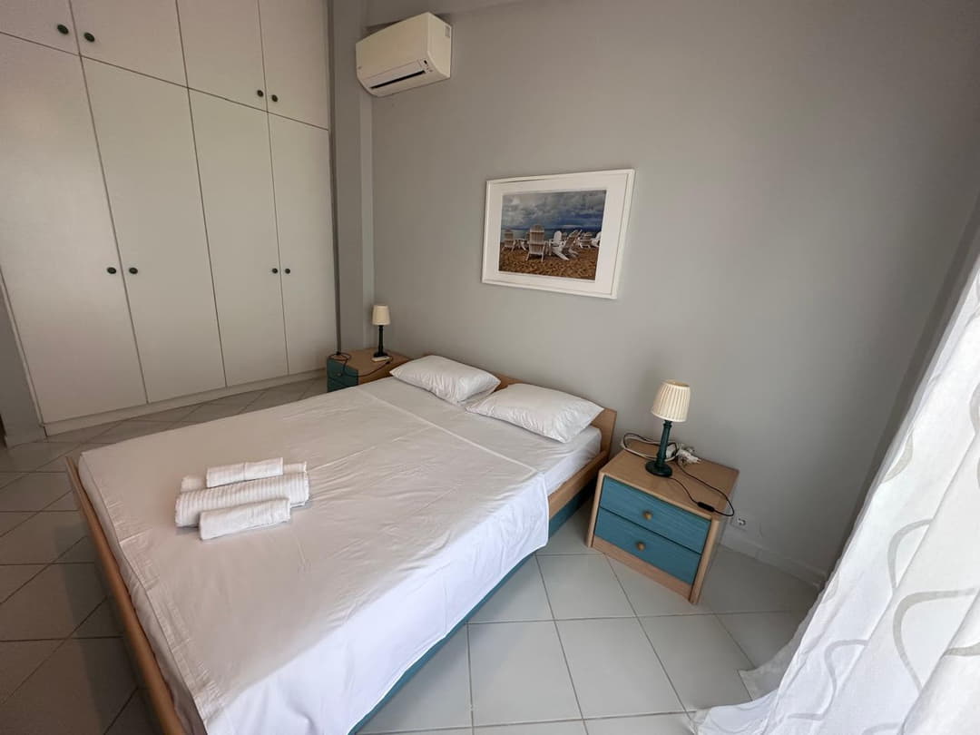 - 1st bedroom: Double bed, air conditioning, sea view, and terrace access.