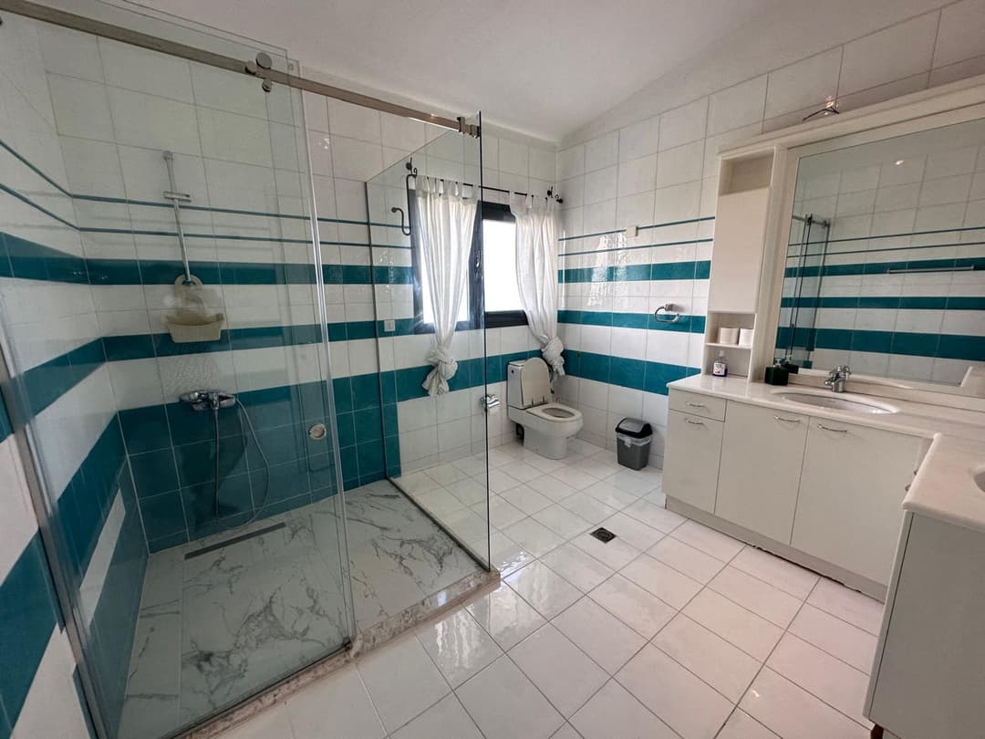 Есть кухня со всем набором утвари, красивая терраса с видом на море, зоной лаундж и обеденная зона с возможностью барбекю. Кондиционеры во всех комнатах, для деток полноценная детская с двухъярусной кроватью. Особенно важно на всех окнах есть шаттерсы, что спасало в жаркие дни.