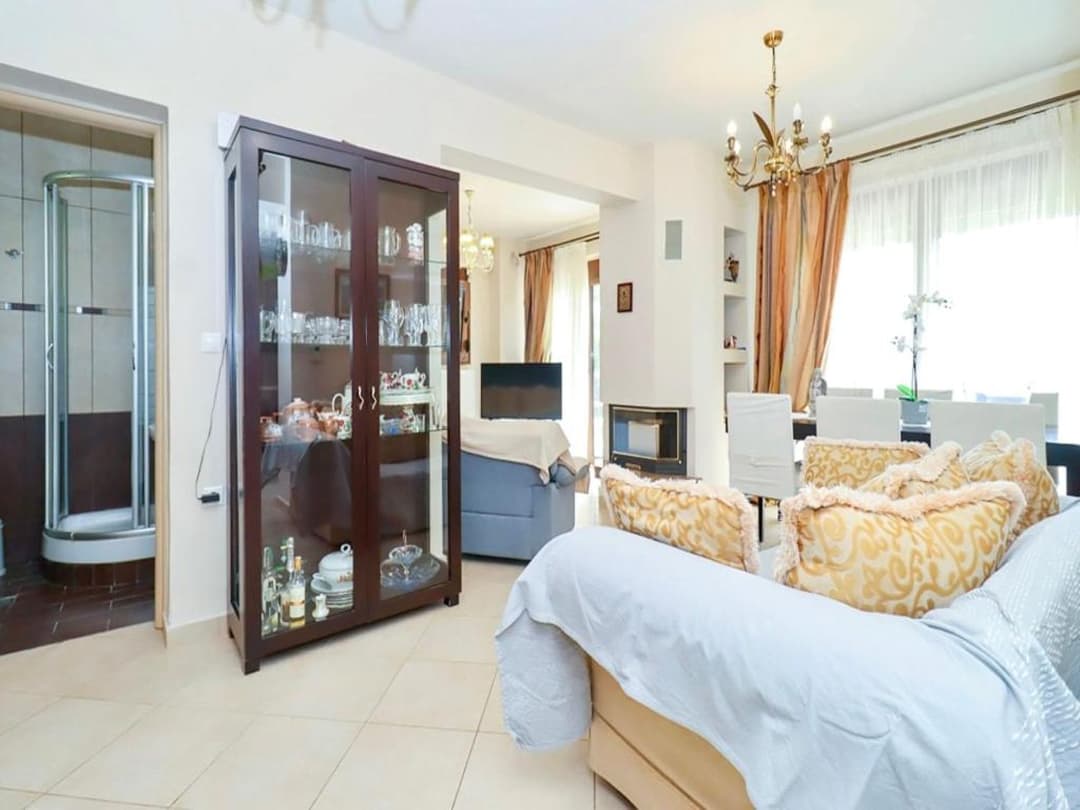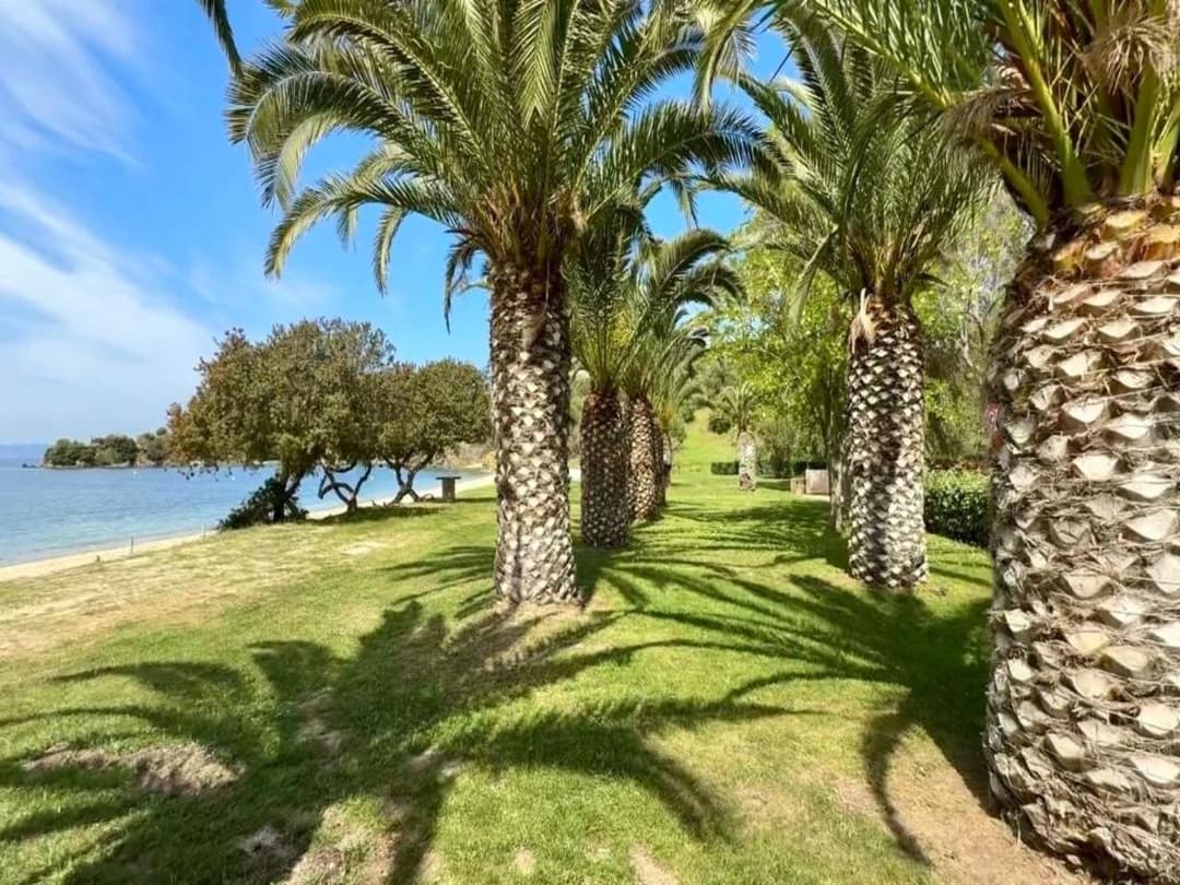 Песчаный пляж, с примесью гальки при входе в воду – в 200 метрах от виллы. Вход в море пологий. Вокруг поселка — сосновые леса. В 10 км расположен поселок Неас Мармарас, где вы найдете таверны, рестораны, кафе, бары, рынок, рыбная и мясная лавка, магазины и пр.