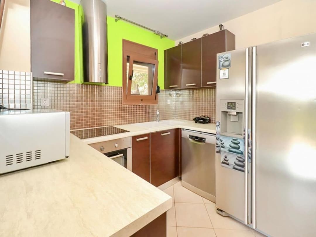 Есть кухня со всем набором утвари, красивая терраса с видом на море, зоной лаундж и обеденная зона с возможностью барбекю. Кондиционеры во всех комнатах, для деток полноценная детская с двухъярусной кроватью. Особенно важно на всех окнах есть шаттерсы, что спасало в жаркие дни.