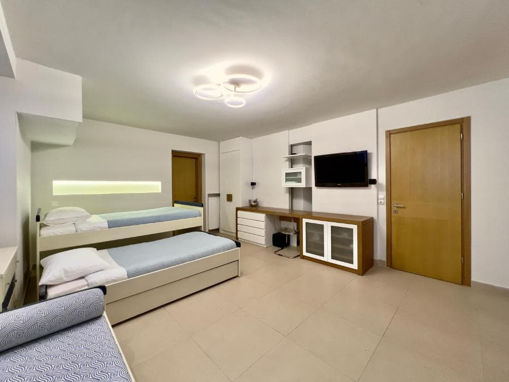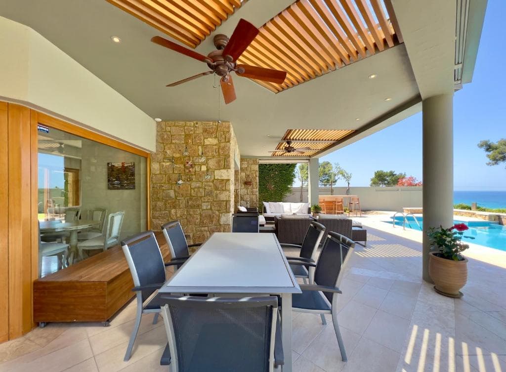 Есть кухня со всем набором утвари, красивая терраса с видом на море, зоной лаундж и обеденная зона с возможностью барбекю. Кондиционеры во всех комнатах, для деток полноценная детская с двухъярусной кроватью. Особенно важно на всех окнах есть шаттерсы, что спасало в жаркие дни.